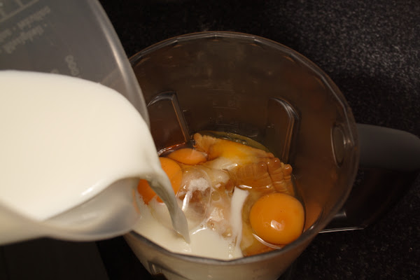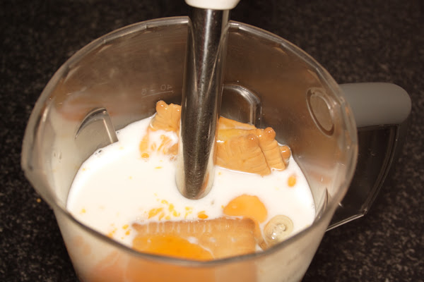 En una jarra o vaso batidor mediano, mezclamos todos los ingredientes, el azúcar, los huevos, la leche y las galletas. Batimos todo con la batidora hasta que quede una mezcla lisa y muy bien ligada.