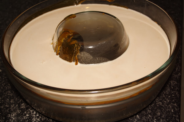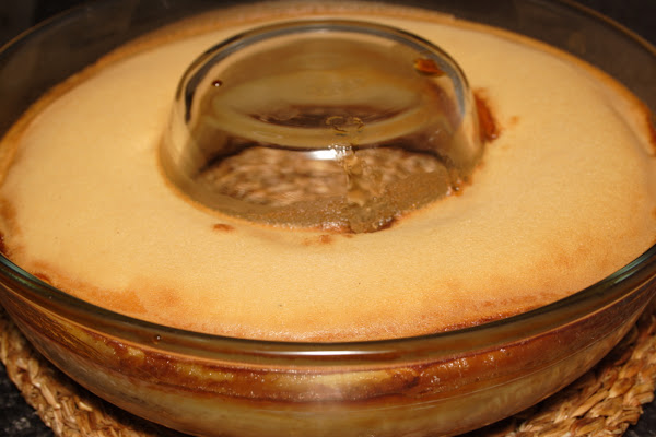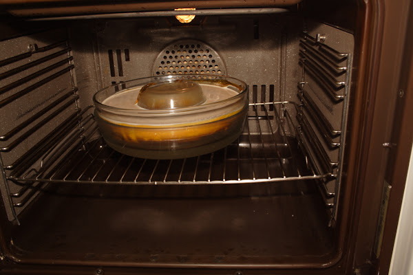 Echamos todo sobre el molde con el caramelo, y metemos en otro recipiente con agua, para cocerlo en el horno a baño María (como podéis ver en la foto).