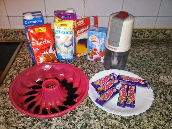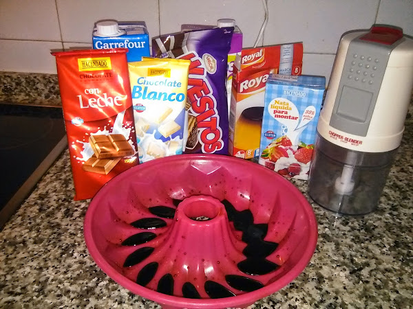 bueno vamos con la forma de hacerlo. En un cazo ponemos la nata (crema de leche) y la leche, reservando en un vaso un poco de leche donde disolveremos el flan, añadimos los dos chocolates en trocitos lo ponemos a fuego lento hasta que los chocolates estén bien fundidos