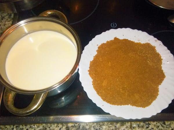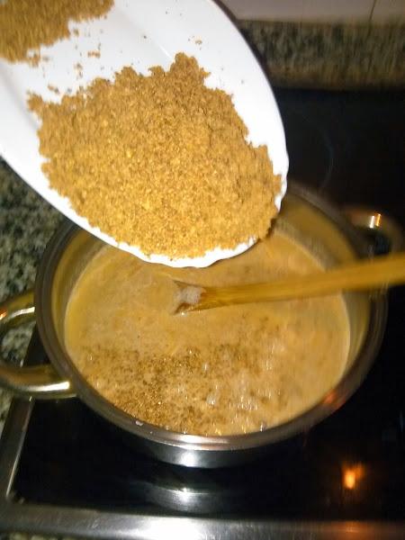 Ponemos los huesitos en la picadora hasta que estén totalmente picados los añadimos al cazo y seguimos removiendo para evitar que se pegue cuando los huesitos están integrados ponemos el sobre de flan en el vaso de leche que teníamos reservada y lo incorporamos poco a poco al cazo sin dejar de remover para que no se hagan grumos , subimos el fuego y cuando empiece a hervir retiramos-