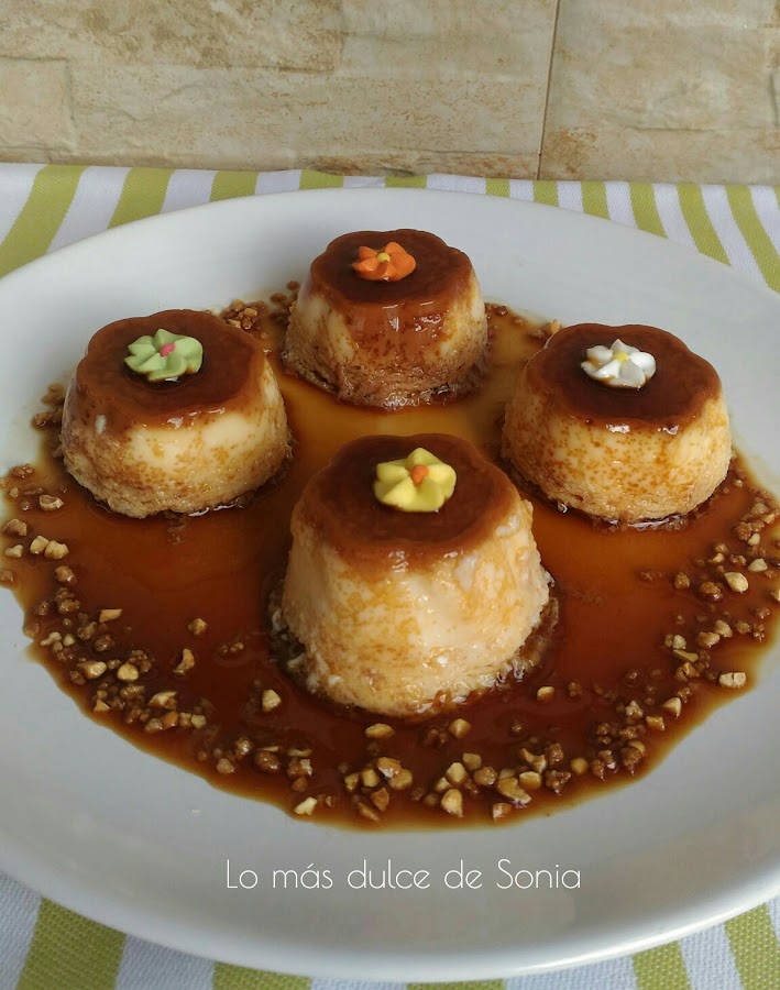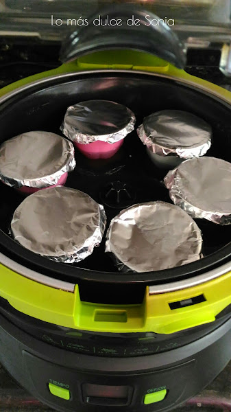 Ponemos caramelo en los moldes y vertemos la mezcla. Tapamos cada molde con papel de aluminio.