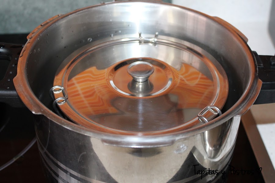 Cerramos y colocamos en una olla mas grande con agua. Cocemos unos 50 minutos a fuego suave.