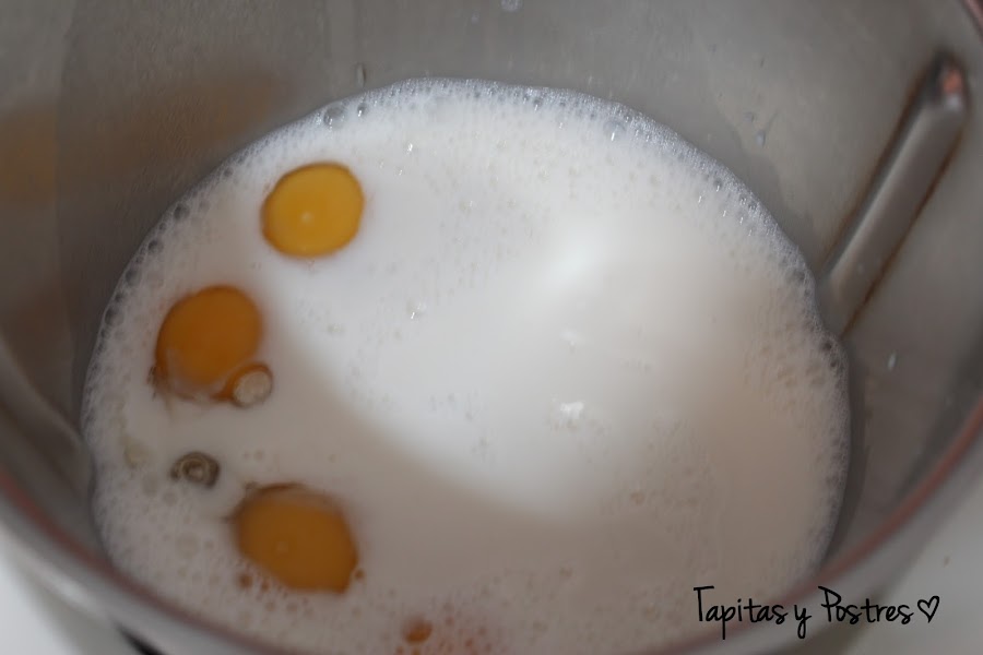 En el vaso de la thermomix ponemos la bebida de almendra, los huevos y el azúcar. Batimos 10 segundos a velocidad 4. Programamos cinco minutos, 90º y velocidad 2.