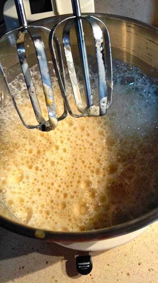 Una vez hecho o echado el caramelo, hacemos nuestra mezcla con los huevos, la leche, el azúcar y las cucharadas de vainilla y canela. Mezclamos todo muy bien (suele quedar espuma).
