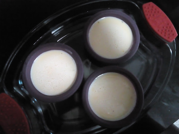 Llenamos los moldes y metemos los flanes al baño maría al horno, que estará previamente precalentado, durante 50 minutos a 180º. Pinchamos con un cuchillo para ver si están listos y cuando estén fríos los metemos a la nevera por un periodo de cuatro horas. Sacamos desmoldamos y listos para comer, se pueden acompañar con nata (crema de leche) o helado.