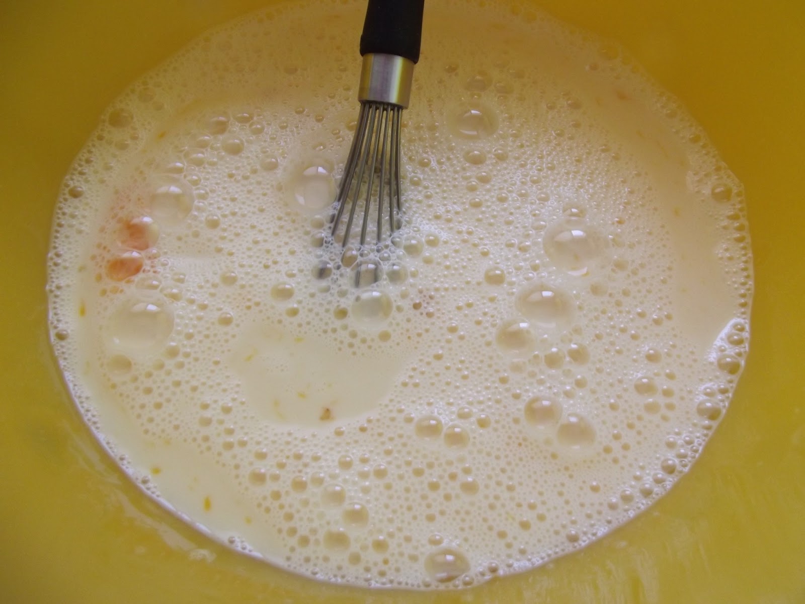 Batir en un bol los huevos, añadir el azúcar y la leche y mezclar bien.