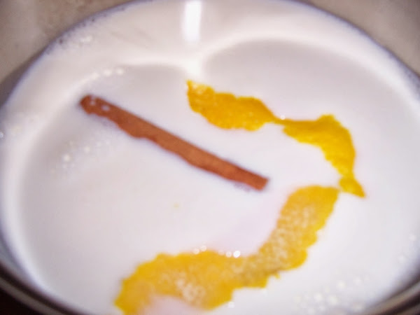 Ponemos la leche a hervir con la corteza de limón (solo lo amarillo ya que lo blanco amarga) y la ramita de canela y en cuanto rompa a hervir retiramos del fuego y colamos.