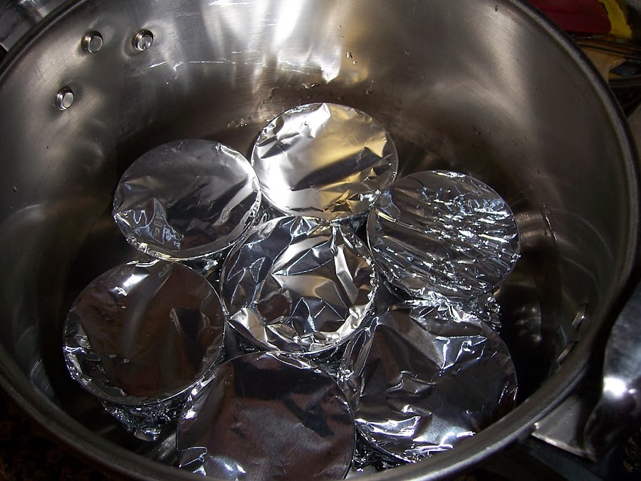 tapamos los moldes con papel de aluminio para que no les caiga agua y ponemos al Baño María con la olla tapada durante 12 minutos en olla exprés y unos 30 minutos en olla normal o hasta que al pincharlos con un palillo salga limpio.