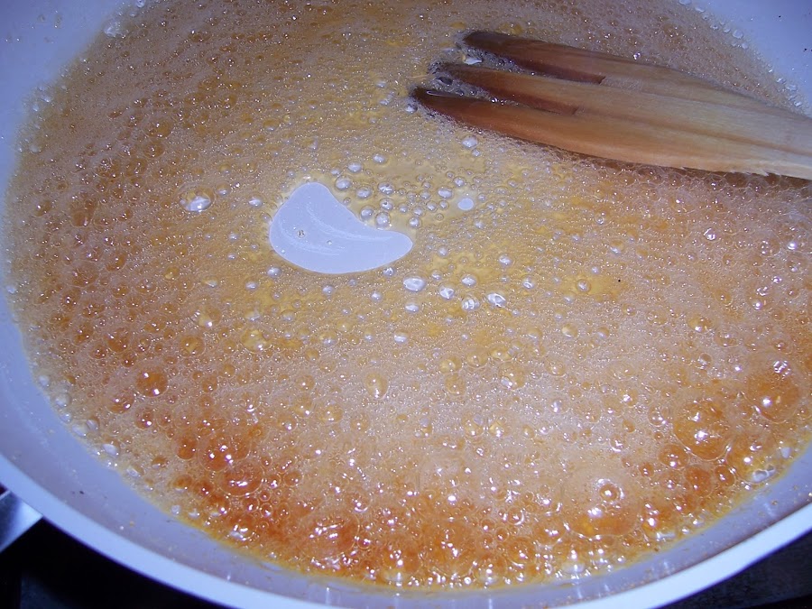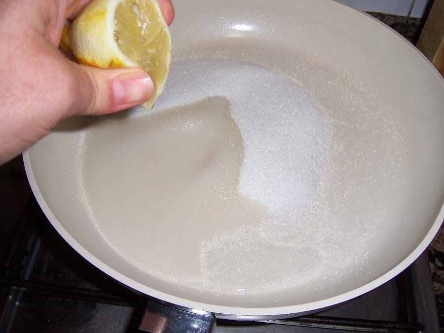 En primer lugar preparamos el caramelo poniendo el azúcar, el agua y el zumo de limón a calentar y sin dejar de mover esperamos a que coja el color del caramelo.