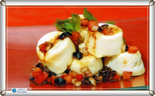 Ingredientes: para 2 personas. Flan de Judías Blancas con Vinagreta de Aceitunas Negras, Cebolla y Tomate.