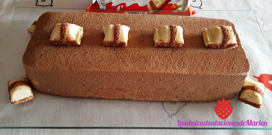 Desmoldamos cuando vayamos a servir y decoramos con las barritas de kinder Bueno echas trocitos y sirope de chocolate.