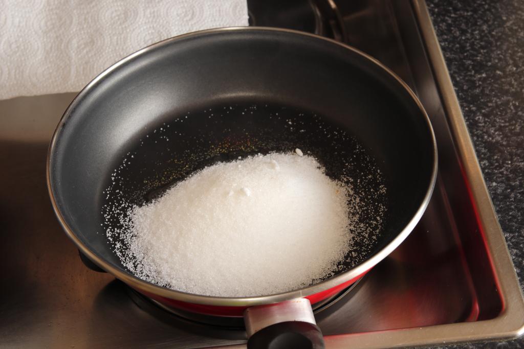 En una sartén antiadherente ponemos al fuego las 6 cucharadas de azúcar para preparar el caramelo. Una vez hecho lo vertemos en el molde y repartimos por el fondo. Reservamos.