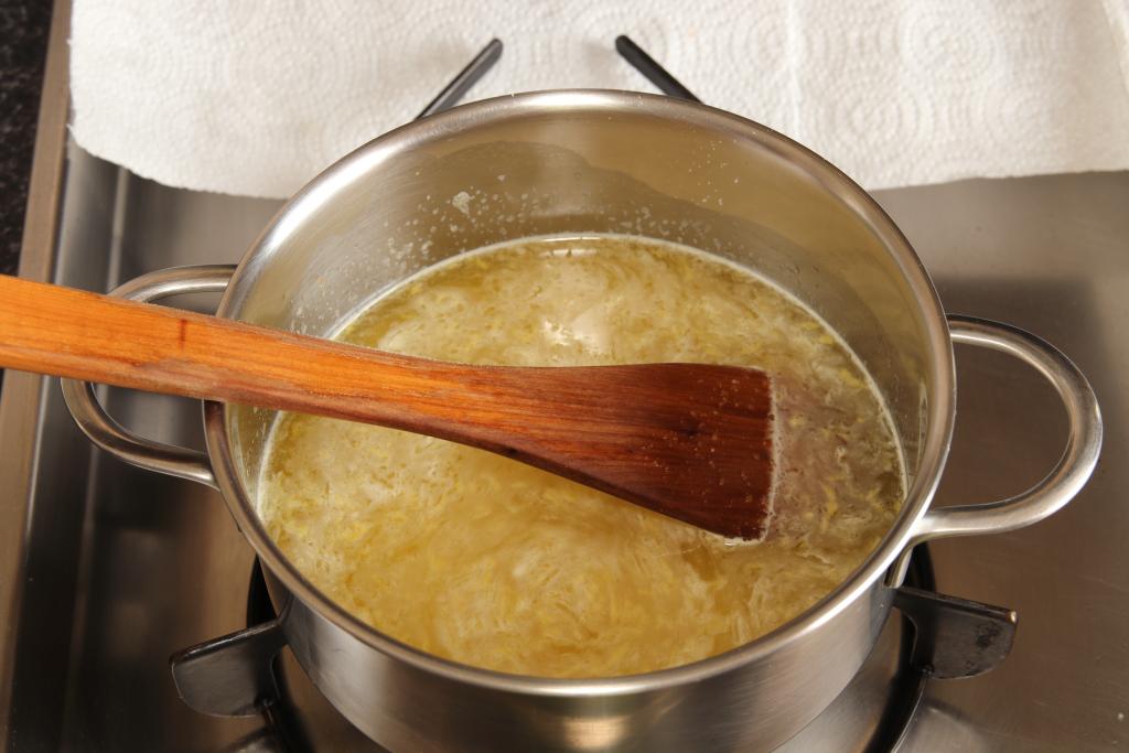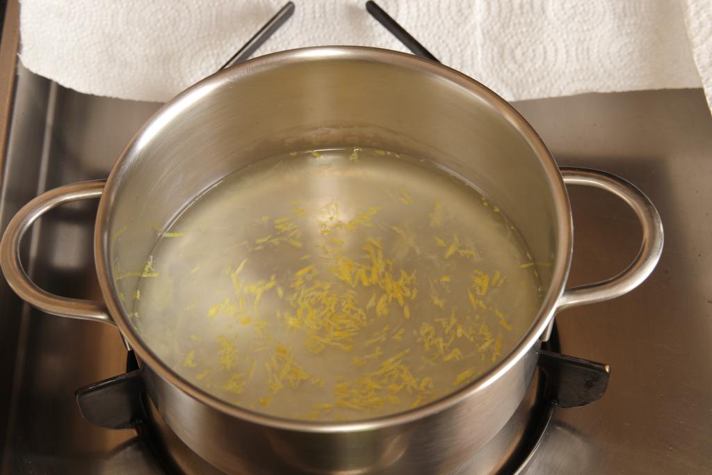 En un cazo vertemos el agua, la ralladura y el zumo de limón, calentamos y añadimos la gelatina, removemos bien hasta que se disuelva.