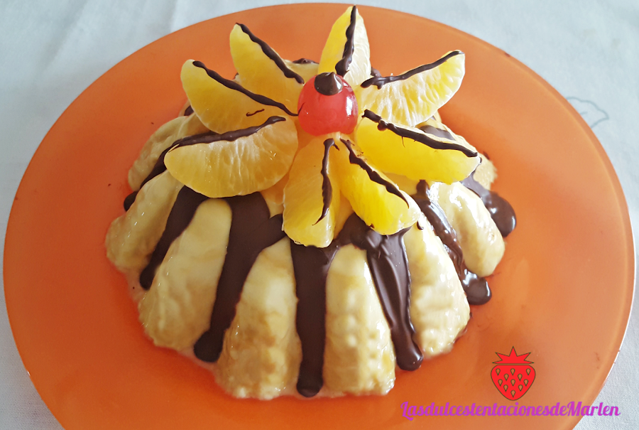 Ahora derretimos el chocolate , se puede hacer al baño maría, ( yo lo he echo en el microondas unos segundos...) Cuando este un poquito templado, bañamos el flan con el... Yo lo he adornado con una mandarina y una guinda confitada..Os lo dejo al gusto.