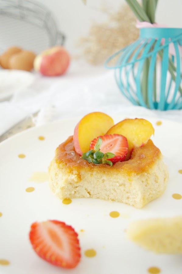 Servimos frío decorado con algunos trozos de fruta. Yo elegí melocotón y fresas.