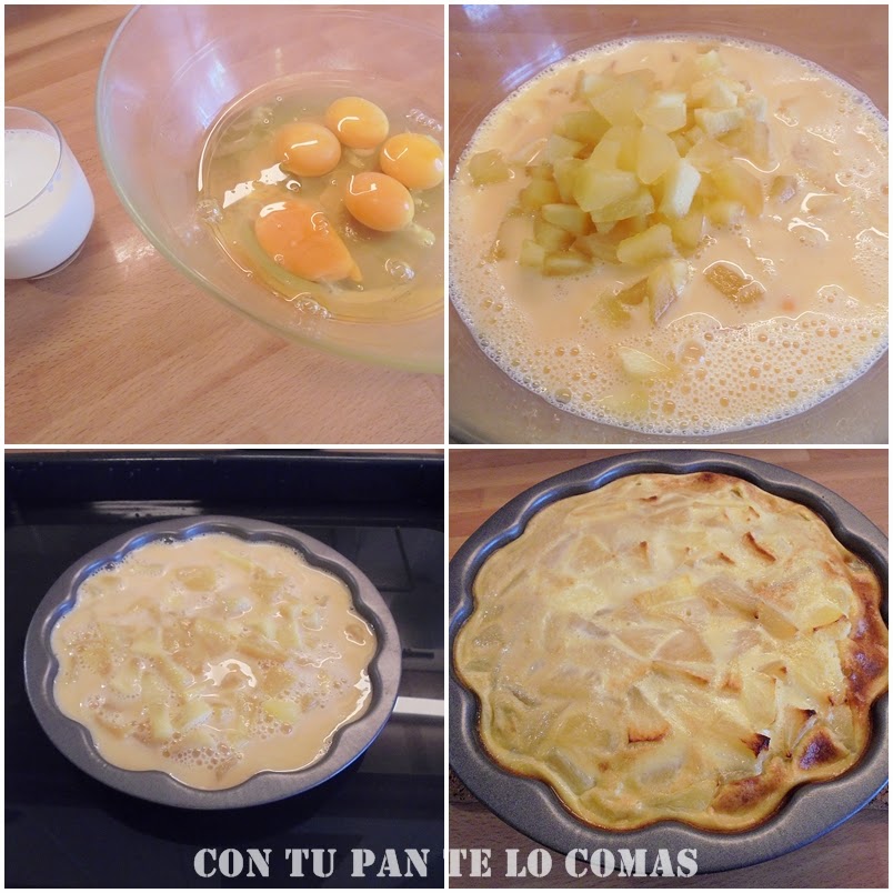 Hoy toca ese postre tan socorrido que le gusta a todo el mundo y aunque según veas las fotos parezca que estás haciendo una tortilla de patatas, es un flan de manzanas. Podríamos decir que es un flan con tropezones porque generalmente se suele presentar con la fruta más deshecha o incluso triturada, pero lo he sacado de un libro del año catapún (tengo muchos de esos) y me apetecía ser fiel a la receta en ese aspecto.