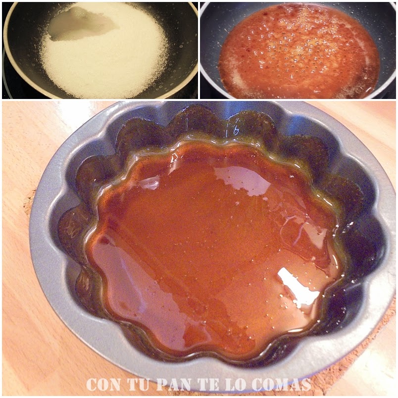 1. Para hacer el caramelo ponemos el azúcar con la cucharada de agua en una sartén y lo ponemos al fuego hasta que se caramelice. No te pases que el caramelo se quema enseguida y luego amarga un montón.