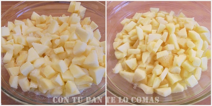 3. Pelamos las manzanas y las cortamos en daditos pequeños. En un bol que pueda ir al micro mezclamos las manzanas con el azúcar y el agua.