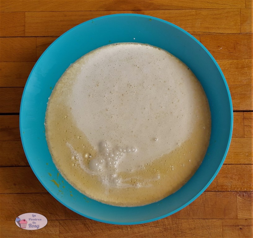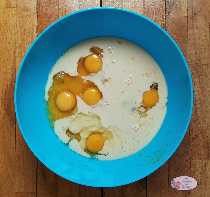 - Añadimos los huevos y la leche y mezclamos hasta que quede integrado.