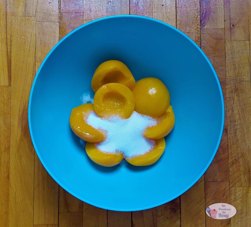 - Escurrimos bien bien los melocotones y los trituramos con el azúcar.