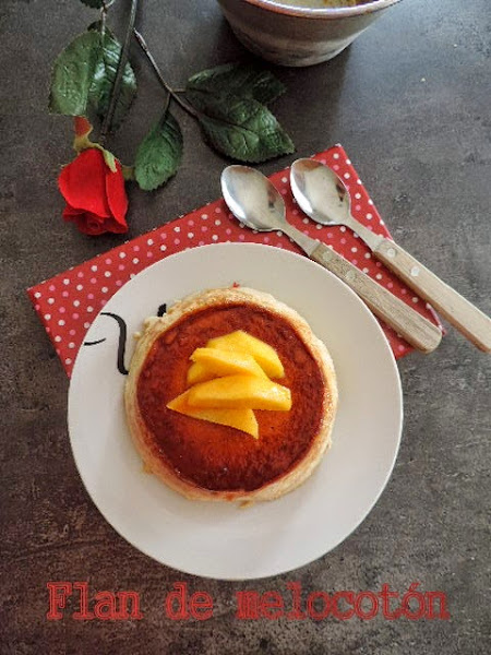 Primero empezaremos preparando una compota con los melocotones (escogeremos los más maduritos)Una vez preparada la compota la dejaremos enfriar completamente antes de preparar el flan.