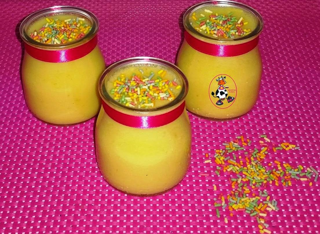 Separamos medio vaso de leche y el resto lo ponemos en un caldero al fuego con dos cucharadas de azúcar. En el medio vaso añadimos los polvos del sobre de flan y mezclamos bien y a la leche le añadimos el Gogo Squeez de melocotón y manzana. Cuando empiece a hervir añadimos el medio vaso de leche con los polvos del flan, removemos bien con las varillas y cuando vuelva a hervir apagamos el fuego. Rellenamos nuestros vacitos o flaneras,dejamos enfriar un poco antes de meter en la nevera. A la hora de servir decoramos con unos fideos de colores y listo para comer.