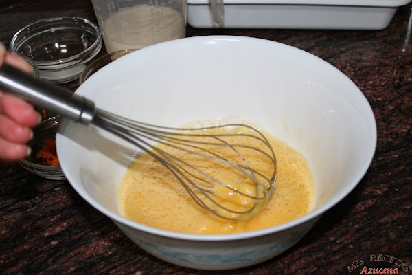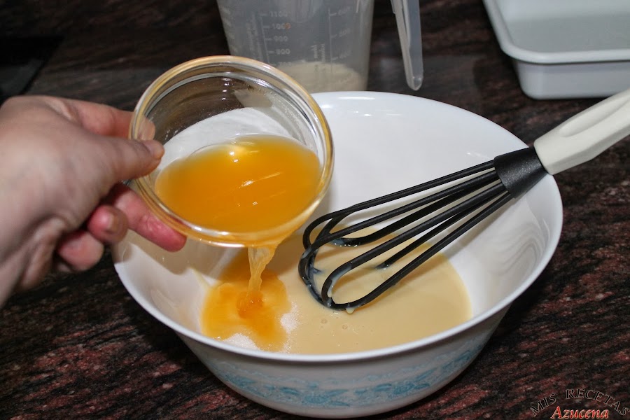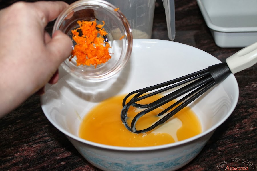 En un bol cascamos los cuatro huevos y los batimos, seguidamente añadimos el azúcar y el zumo de naranja, mezclamos bien hasta que el azúcar se disuelva.