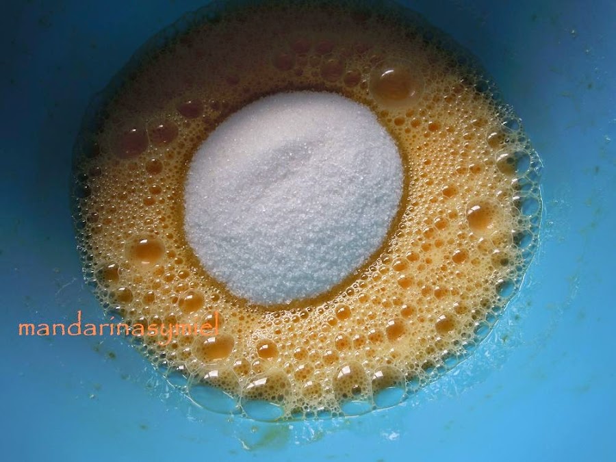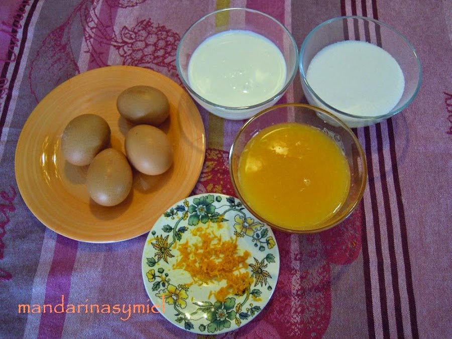 4 huevos.200ml. de zumo de naranja.200ml. de leche entera.180gr. de azúcar.Ralladura de naranja.