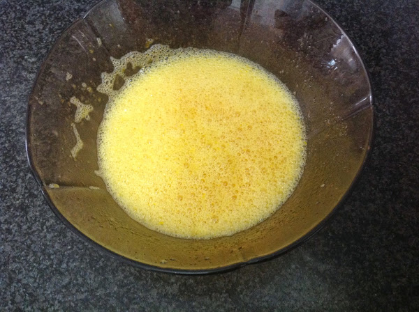 b) Ponemos en un bol los huevos, el zumo de naranja y el azúcar, batimos muy bien hasta que adquiera cierta cremosidad.