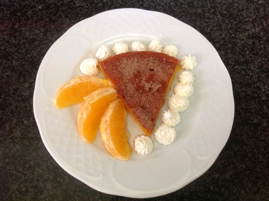 e) Cortamos una ración y decoramos poniendo un poco de nata montada (crema de leche) alrededor, unos gajos de naranja y espolvoreamos un poco con chocolate en polvo por encima.