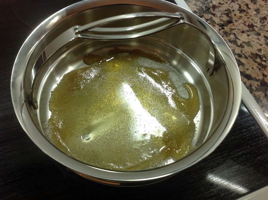 c) Vertemos la mezcla en la softiera con cuidado para no romper la lámina de caramelo; después la introducimos en la olla, a la que previamente le ponemos un vaso y medio de agua.