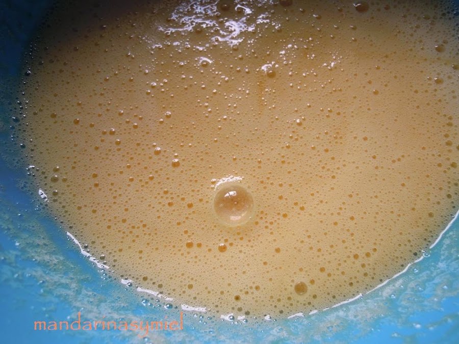 Añade a los huevos la leche templada y el zumo de naranja, sigue batiendo.