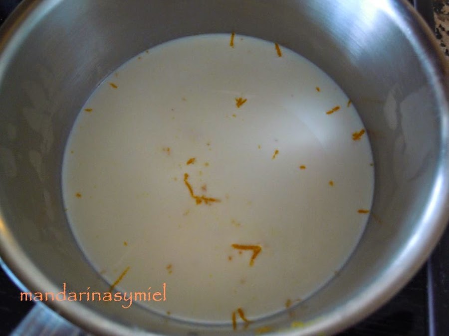 En un cazo al fuego, pon a calentar la leche con la ralladura de naranja, no hace falta que hierva. Apaga el fuego y espera a que se enfríe un poco.