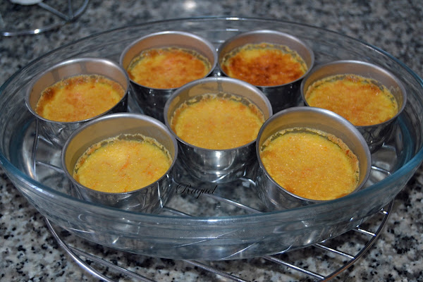 Mételo en un recipiente de cristal resistente al calor, mete dentro los flanes y cubre de agua caliente hasta la mitad de ellos, para hacerlos al baño maría.
