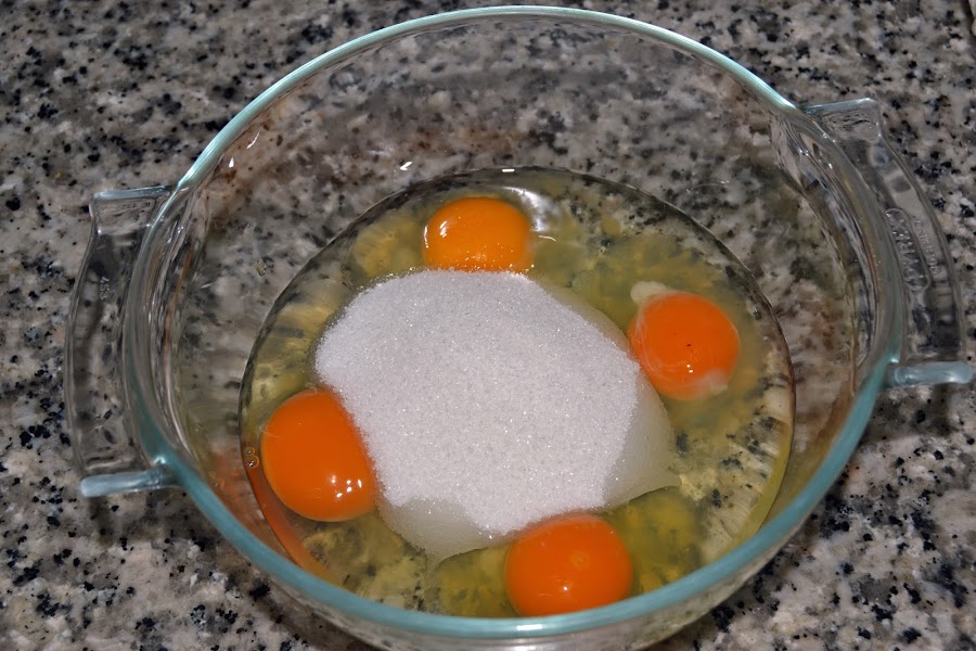 Pon en un bol los huevos y el azúcar, mezclalo bien.