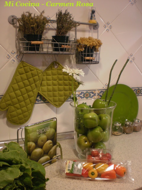 Me encontraba en mi cocina, donde todos los detalles decorativos son de color verde, un color que da alegría y vitalidad a ésta habitación tan importante para quienes nos gusta cocinar, la gama no es muy amplia va desde el verde manzana del logo de mi blog que impera en las cojines y en las cortinas, abarcando hasta un verde claro ?limón? y sobresale entre ellos el verde pistacho; desde paletas, servilletas, delantal, manoplas, tazas e incluso los moldes de silicona.