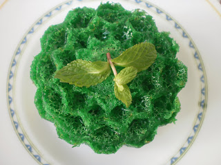 Pués bien, en mi cortado ensoñamiento, tenía en las manos un precioso molde de silicona de color verde pistacho con seis huecos con forma de frutas o flores, con el que hice éste riquisimo bizcocho de peppermint