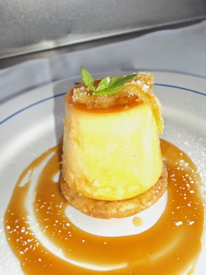 En este caso es un flan de naranja acompañado de una rica salsa y con un aporte de crocante.