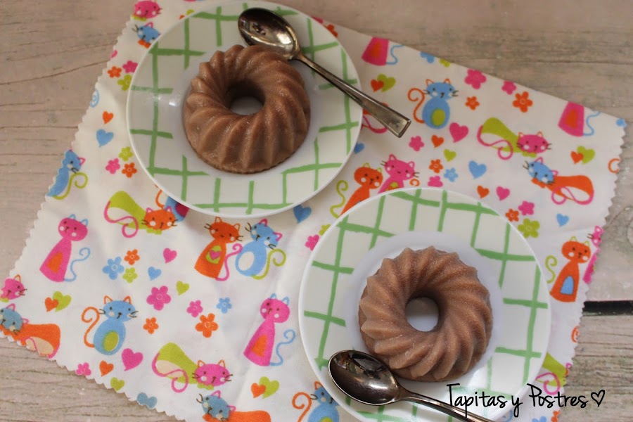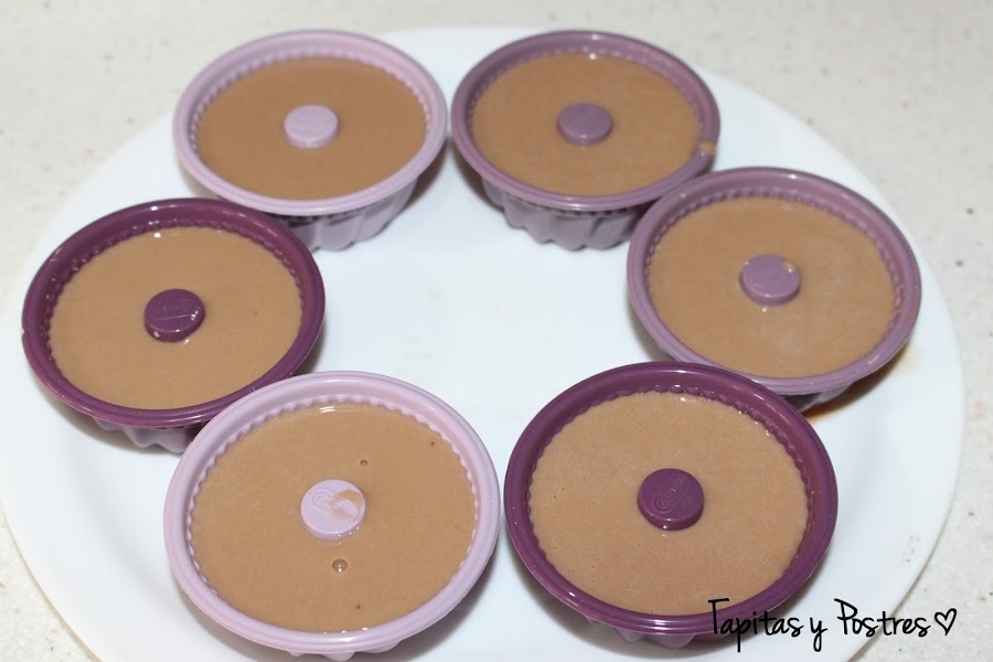Vertemos en flaneras individuales, aptas para el microondas y horneamos 4 minutos a potencia máxima (en mi horno son 800w). Dejamos dentro sin abrir dos minutos al acabar y después dejamos enfriar y a la nevera.