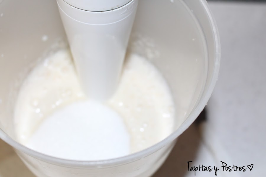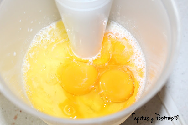 Añadimos los huevos y el azucar. Seguimos batiendo.