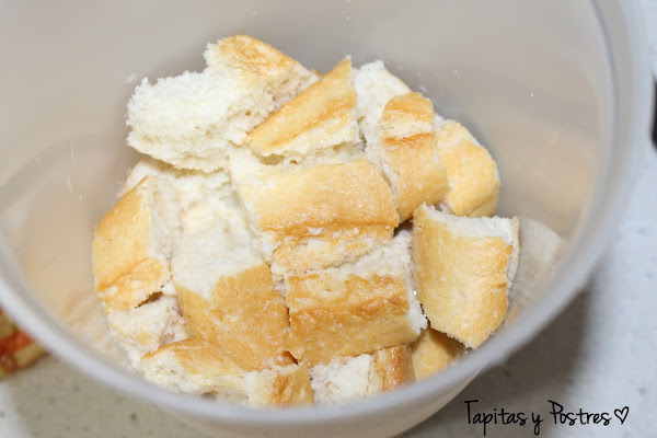 Ponemos el pan troceado en un recipiente con la leche y dejamos cinco minutos. Trituramos con la batidora hasta tener una masa homogénea. añadimos el azúcar y los huevos y batimos.
