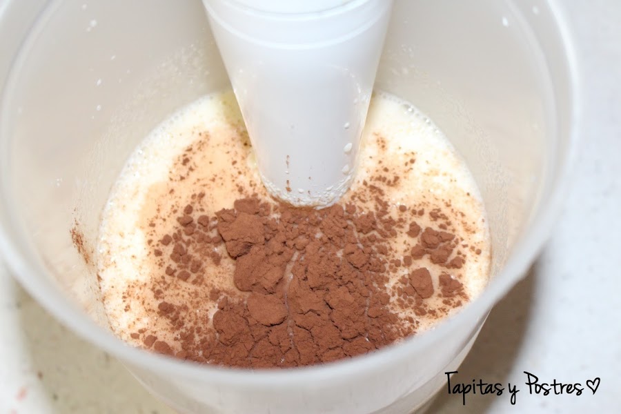 Por último incorporamos el cacao y mezclamos. Yo he usado cacao sin azúcar, pero podéis poner cacao soluble del que tomamos en el desayuno.