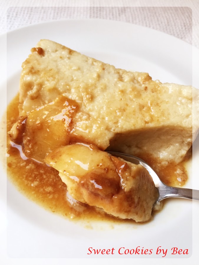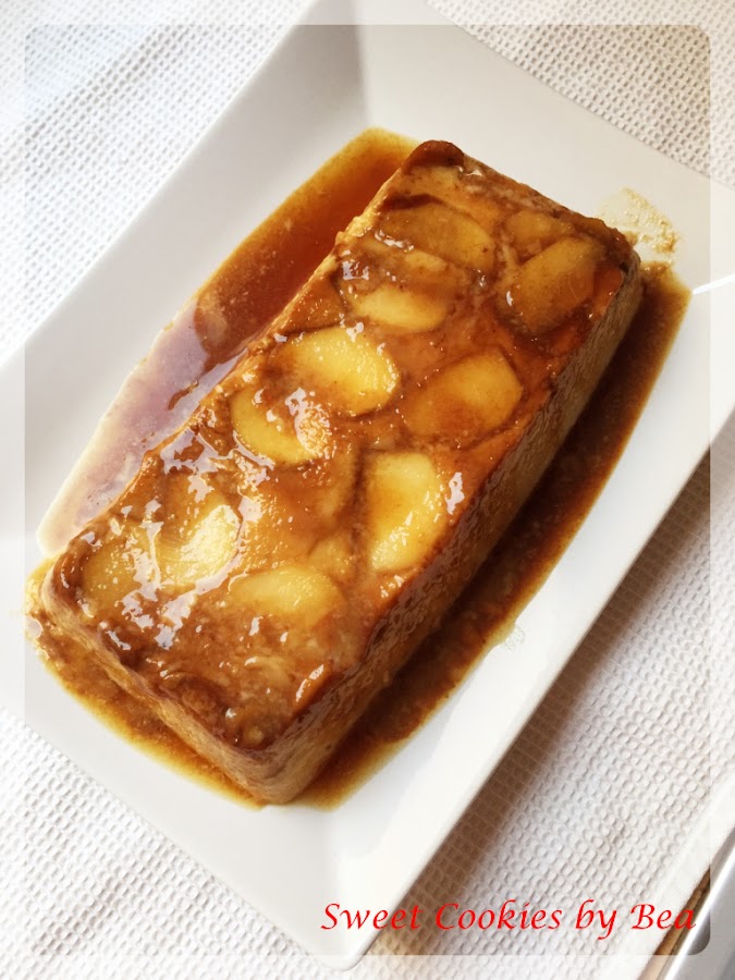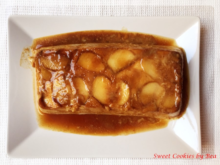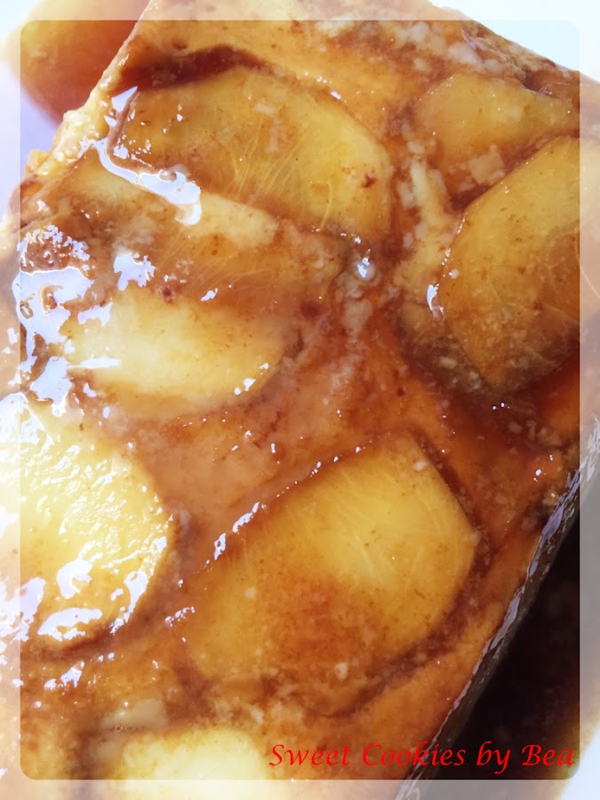 Caramelizamos el molde que vamos a usar, la otra pieza de fruta la cortamos en laminas y colocamos en la base del molde. Ponemos nuestra mezcla con cuidado que los trozos de fruta no se muevan.