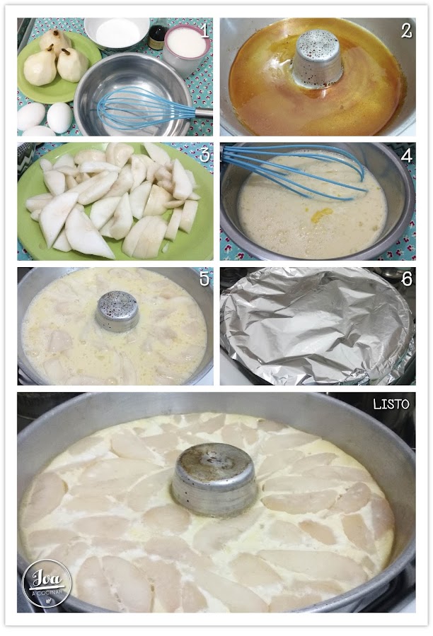 Por otra parte en un bowl batimos los huevos junto a la leche, incorporamos el azúcar y agregamos la vainilla o ralladura de limón. Mezclamos bien y volcamos esta preparación sobre las peras.