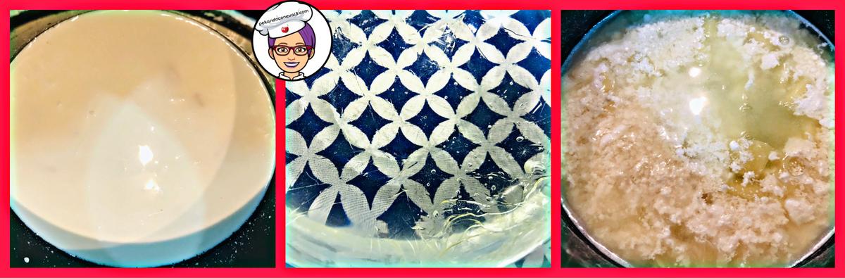 hidratamos las hojas de gelatina en agua fría , una vez estén listas las escurrimos bien y las disolvemos en la mezcla que calentaremos hasta que hierva y se haya disuelto bien.