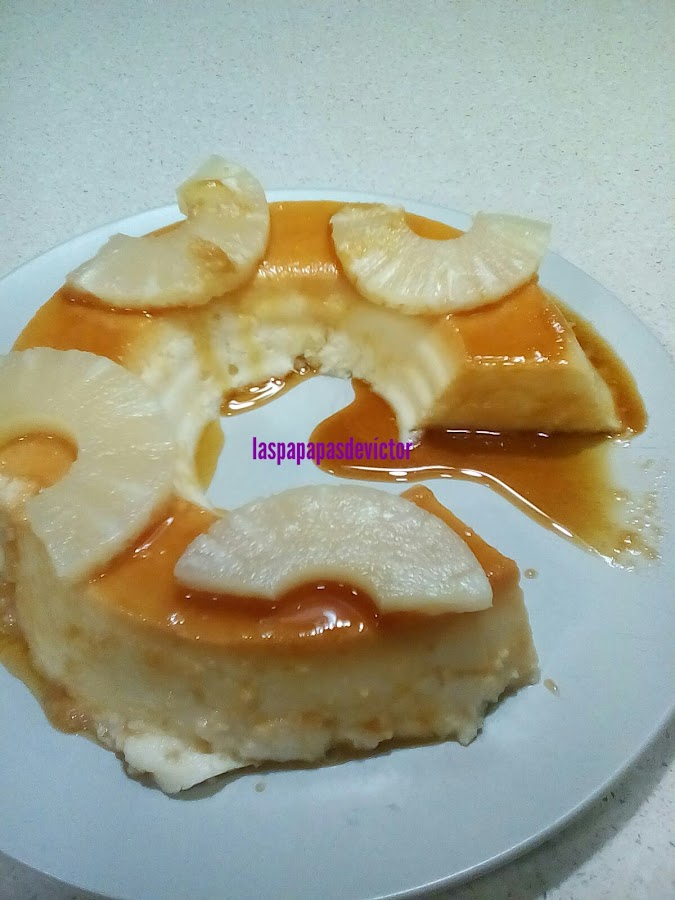Le dais la vuelta y lo emplastáis decorándolo con las rodajas de piña