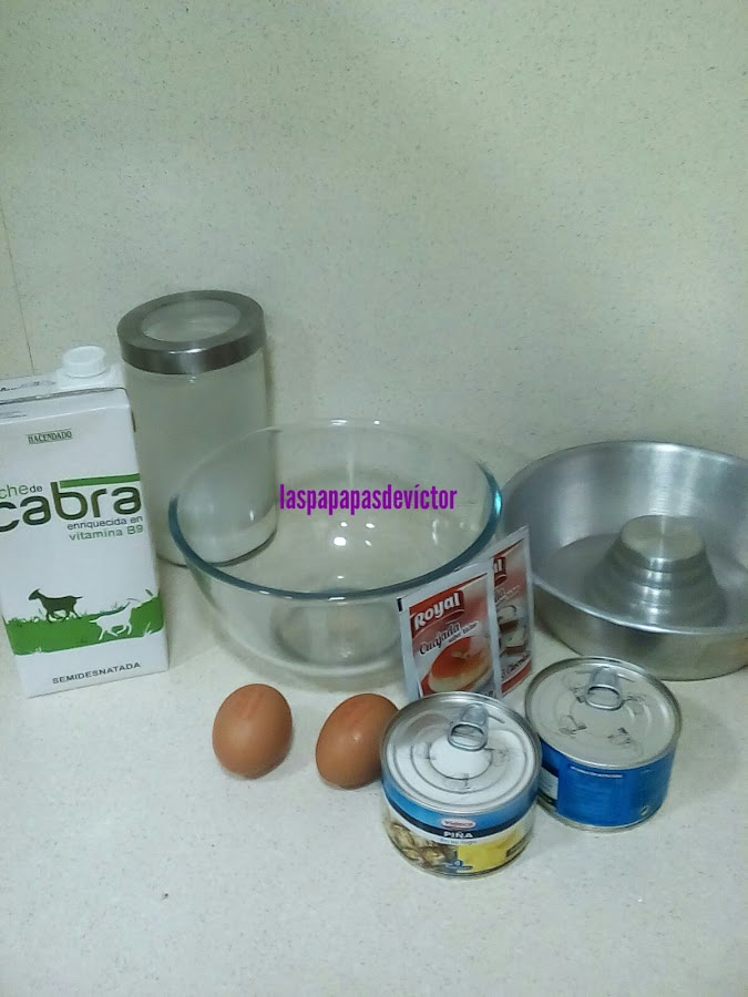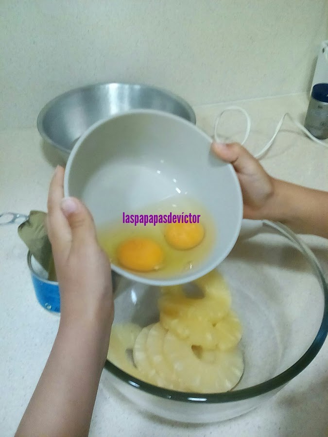 En un bol alto, que el peque ponga os dos botes de piña, reservando dos para después decorar y sin el zumo y que añada los huevos