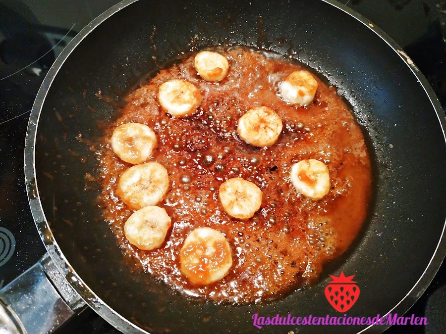 Ponemos el azúcar y la mantequilla en una sartén, a fuego lento. Pelamos y cortamos los plátanos en rodajas, los rociamos con el zumo de limón y los introducimos en la sartén. Dejamos que se caramelicen y retiramos del fuego.