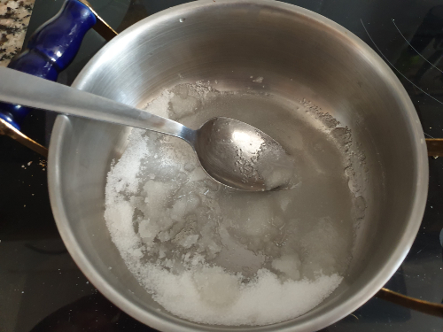 Hacemos el caramelo poniendo el azúcar en un cazo con un par de cucharadas de agua.