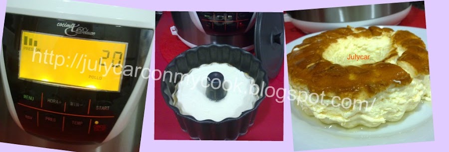 Batir todos los ingredinetes menos el caramelo liquido , poner el caramelo en el molde de puding, verter la mezcla del flan tapar el molde, poner 2 vasitos de agua en la cubeta de la Cocimix DeLuxe, meter el molde dentro, tapar con válvula cerrada, menú pollo/ carne, 20 minutos, presión III, cuando termine, apagar y dejar despresurizar por si sola, sacar y dejar que termine de enfriarse antes de desmoldear, meter en el frigo unas horas antes de comer